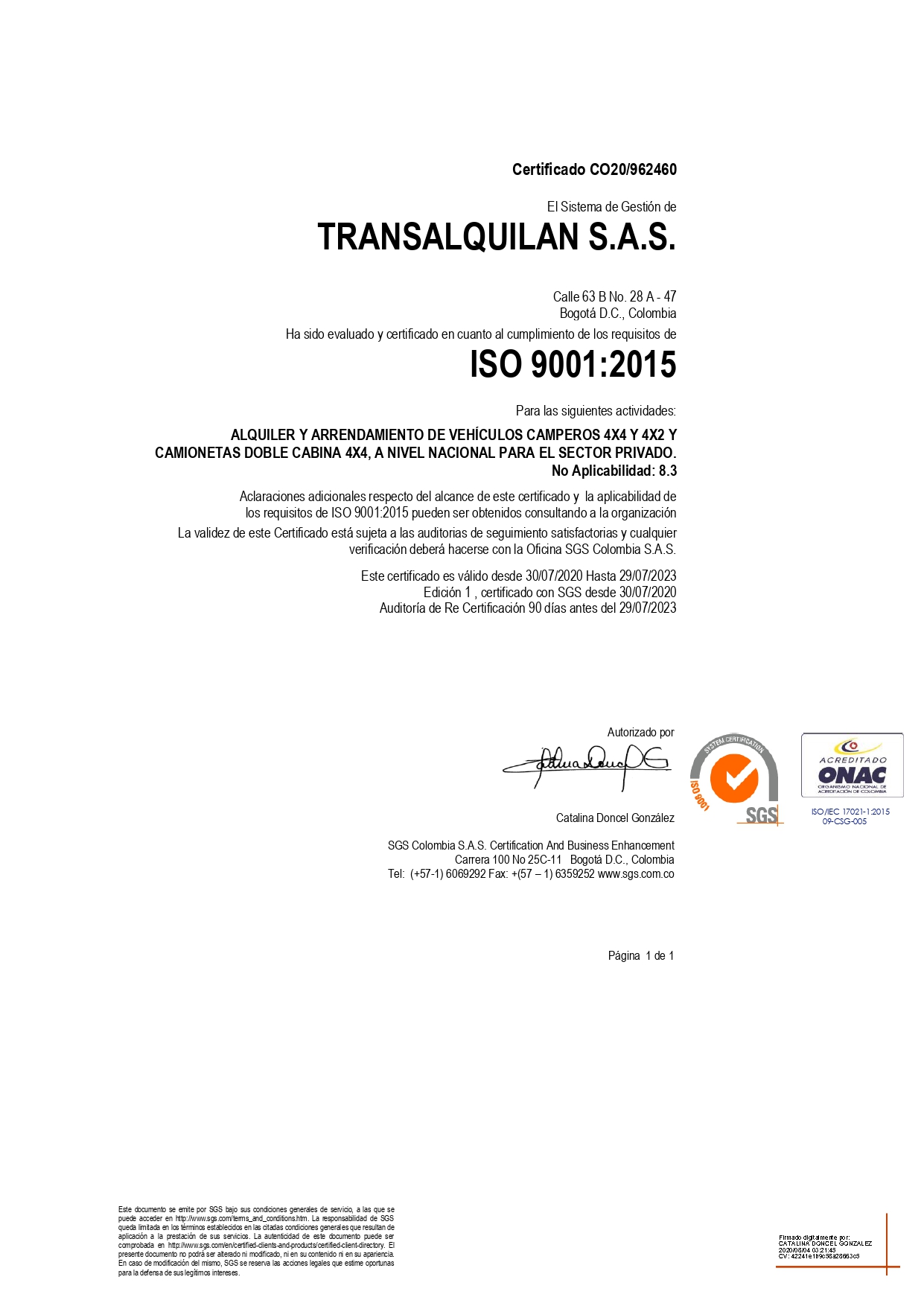 Transalquilan, con su eficiente recurso humano, presta servicios de alquiler de vehículos, con aliados estratégicos para diversos sectores públicos y privados, generando rentabilidad para sus accionistas y bienestar social para la comunidad; mediante el desarrollo de sus procesos, fijados por parámetros internacionales de calidad, medio ambiente, seguridad y salud en el trabajo.